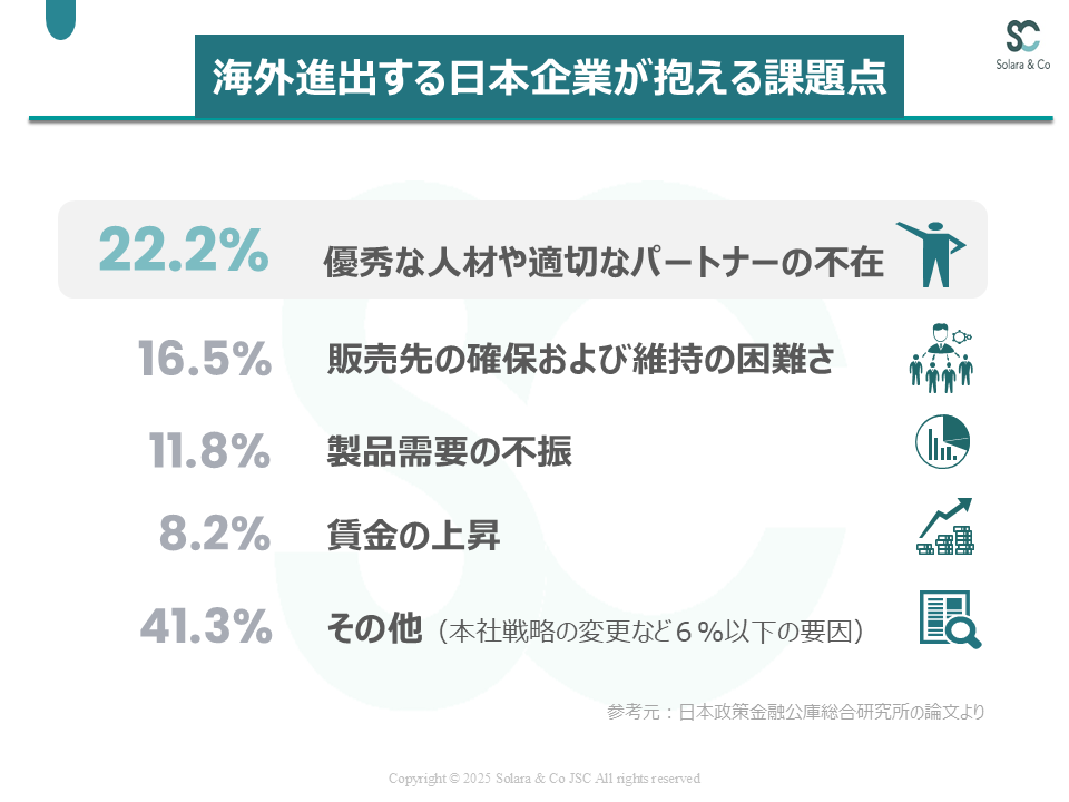 日本政策金融公庫総合研究所の調査によると、海外進出における最大の課題は、「優秀な人材や適切なパートナーの不在(22.2%)」であることが示されています。
