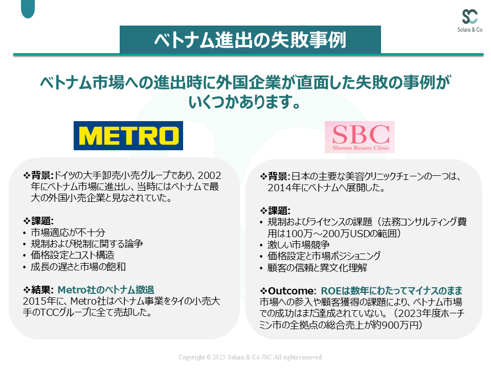 法規制の壁、文化の違い、そして激しい市場競争は、メトロ(ドイツの大手卸売小売グループ)やSBC(日本の主要な美容クリニックチェーン)のような大手企業にとっても、市場定着への大きな障壁となりました。