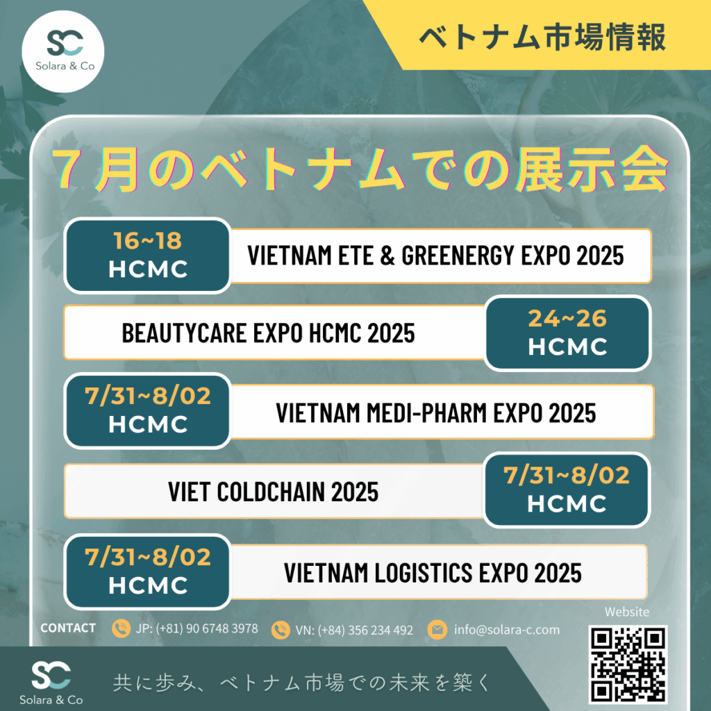 2025年7月、ベトナム市場では多くの大規模な展示会が開催され、国内外の企業から大きな注目を集めています。これらの展示会は、最新の業界動向を知り、取引先やパートナーとのつながりを広げる良い機会となっています。