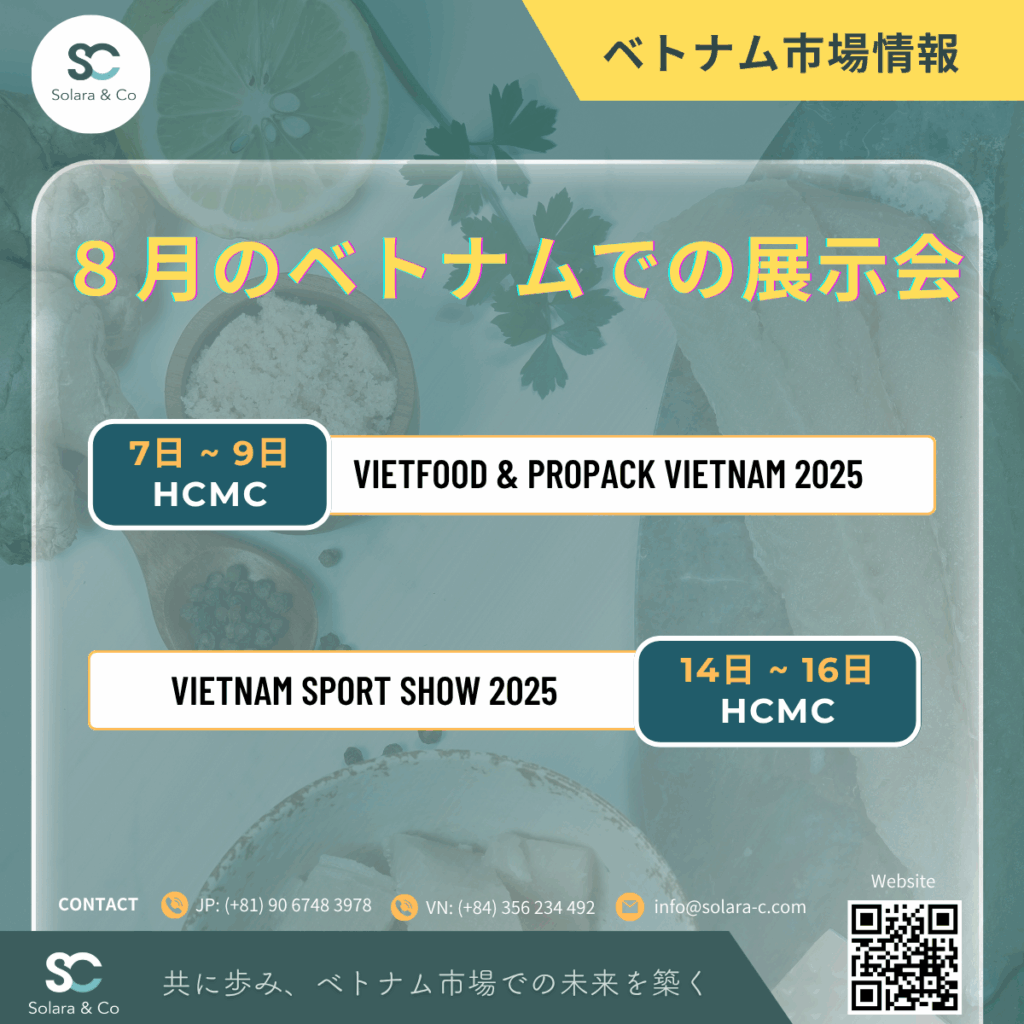 8月の展示会数は前月に比べやや減少したものの、ベトナム市場では依然として注目すべき商業イベントが続き、活気に満ちた雰囲気と有望なビジネス機会が広がっています。食品およびスポーツ分野における最新トレンドの把握、潜在的パートナーとのネットワーキング、新たな展開の発見には、引き続き理想的な時期です。